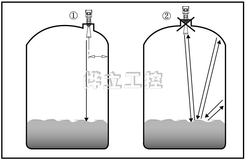 2.错误:仪表被安装在拱形或圆形罐顶,会造成多次反射回波,在安装时应尽可能避免。
