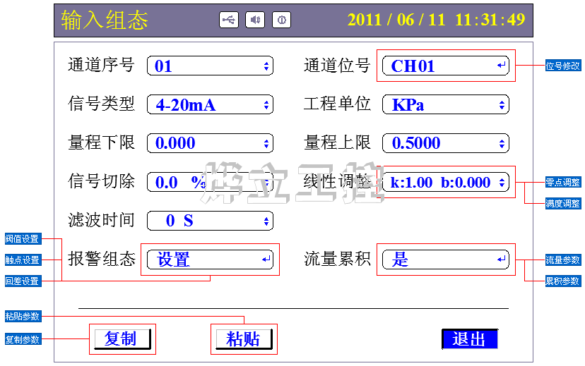 4、其它参数根据需要设置【开通流量运算通道输入组态中的报警组态即为流量报警】